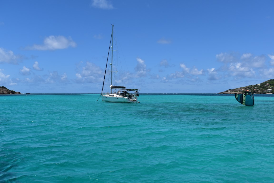 Als het weer wat meer buierig wordt, varen we naar Clifton te Union island. Een berucht Frans kitesurf-kampioen heeft daar een grote business: een hippe eettent ‘The Snack Shack’ met heerlijke reuze panini’s, een trendy soevenier-shopke ‘Salty Girl’ dat ik bijna helemaal kan leegkopen en een kitecenter ‘JT Procenter’. We worden vaste klant bij het kitecenter: een koffietje terwijl de kids bengelen in de geïmproviseerde kiters-speeltuin en een babbel met eigenaar Jeremie. De “Jezus walk” -het trucje waarbij je springt, board vastneemt, blootvoets over het water loopt, voeten terug in het board zet en verder vaart alsof er niets aan de hand is- werd door hem uitgevonden en met veel enthousiasme aan ons geshowd. Bert probeert tevergeefs, maar het levert enkel hilarische bloopers op. Toch vinden de kids hun papa nog steeds de beste kiter!