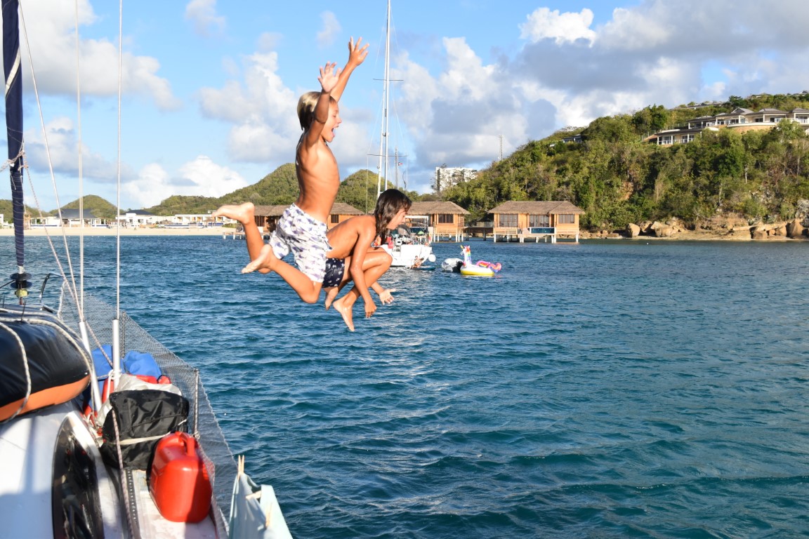 Taxi “Maxi” of Taxi “Alix-Lyam” zorgen er steeds voor dat slechts 1 dinghy per boot ligt en brengen zowel kids als ouders van boot naar boot. Op Ch77 VHF oproepen als een taxi nodig is en dan komt ofwel Hubert’s zoon (Maxi) of team Alix-Lyam (Alix start de motor en Lyam stuurt, keischattig!). Zo worden de prinsesjes Roxie en Juliette van Temanu’a naar Echo, naar Blue Wave en weer teruggebracht. De vrouwen worden na de dagelijkse yogasessie op de catamaran terug naar de boot gebracht. Sundowner-time worden we opgepikt voor een aperitiefje en vaak ook gevolgd door een gezellig (familie)diner. Fantastisch hoe de kids zelfstandig met de 10pk rondvaren, alsof het de normaalste activiteit is voor een 8-9 jarige!